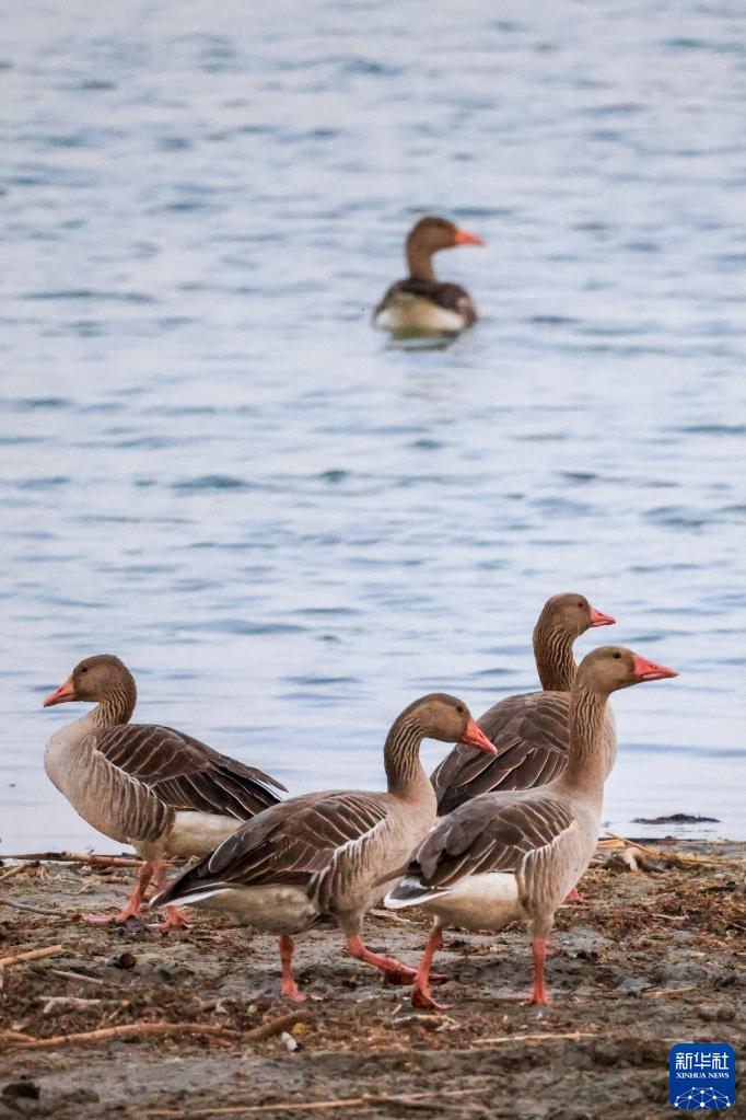 灰雁在新疆博斯騰湖覓食(3月17日攝)。