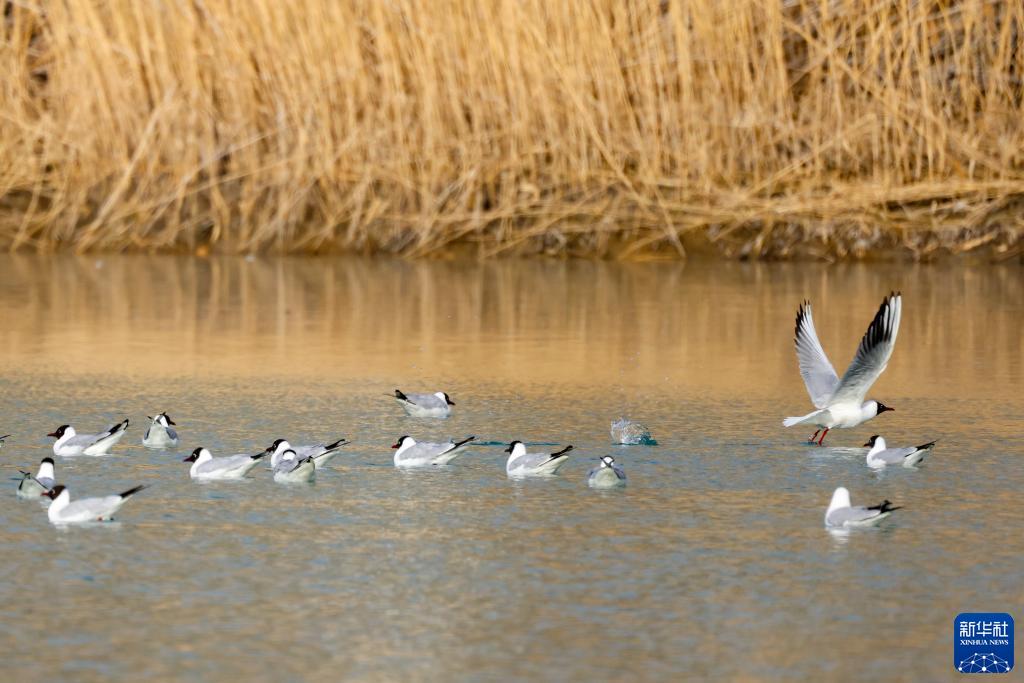 紅嘴鷗在新疆博斯騰湖棲息(3月18日攝)。