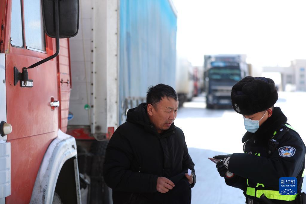 在滿(mǎn)洲里公路口岸,移民管理警察(右)在檢查貨車(chē)司機的相關(guān)證件(3月15日攝)。