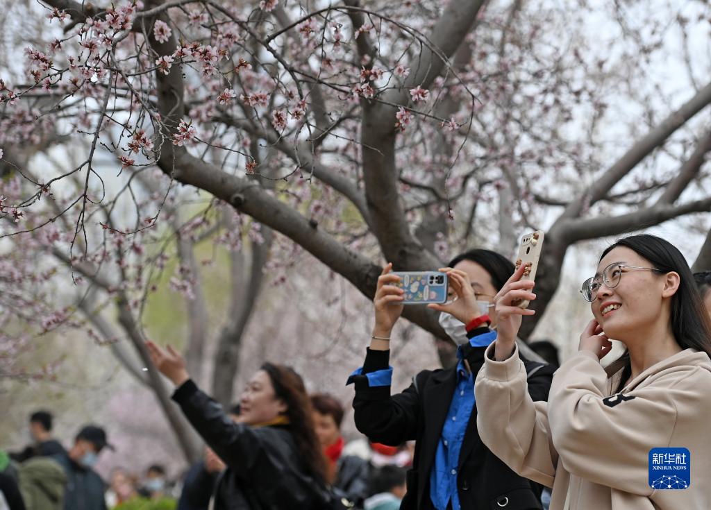 3月19日,游客在天津市紅橋區北運河畔的桃花堤上拍照。