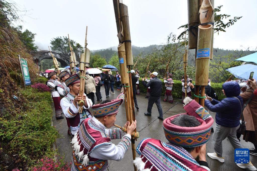 3月19日,在廣西融水苗族自治縣雙龍溝森林旅游度假區,苗族同胞用歌舞歡迎來(lái)自廣東省湛江市的游客。