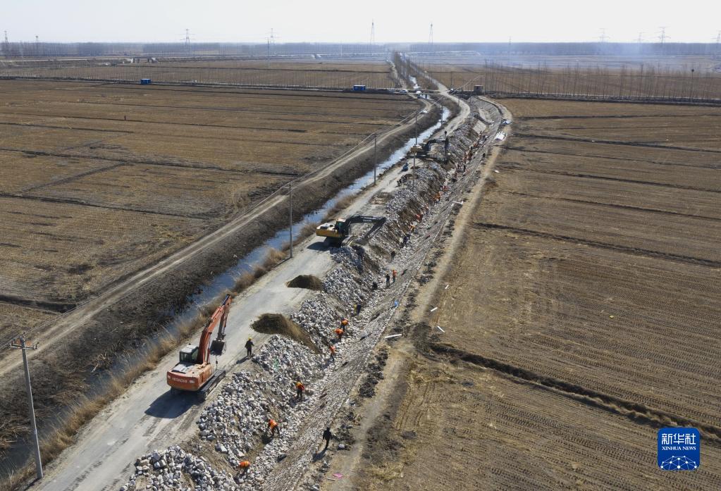 3月19日,工人在唐山市豐南區西葛鎮東尖坨一村高標準農田灌溉水渠改造工地施工(無(wú)人機照片)。