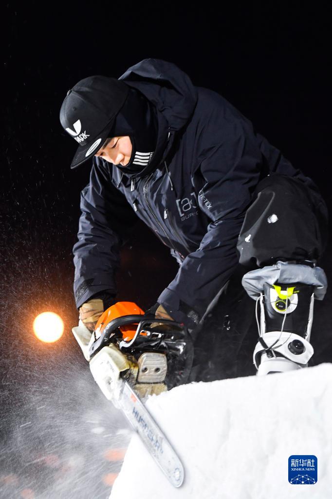 這是2022年12月9日,魏維使用電鋸進(jìn)行跳臺塑形工作。