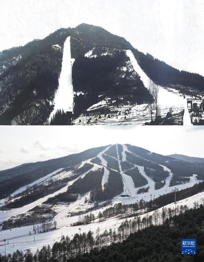 這是一張拼版照片。上圖:早年間僅有兩條雪道的金廠(chǎng)滑雪場(chǎng)(資料照片);下圖:2023年2月10日拍攝的萬(wàn)峰通化滑雪度假區(無(wú)人機照片,新華社記者許暢攝)。