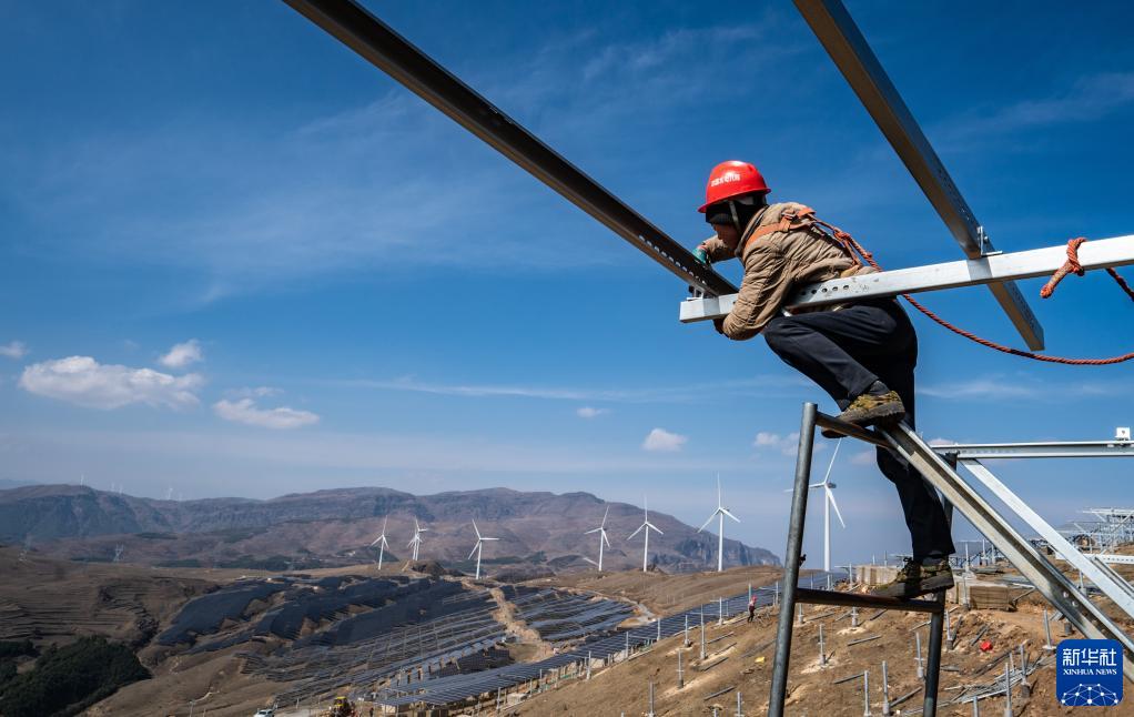 工人蘇天云在安裝光伏發(fā)電設備(3月19日攝)。