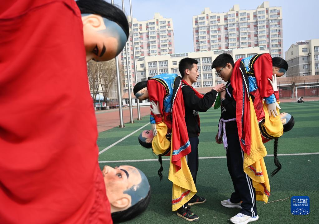 3月20日,隆化縣職教中心學(xué)生在練習國家級非遺項目“二貴摔跤”前互相整理衣物。