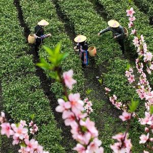 3月20日,在湖南衡陽(yáng)常寧市塔山瑤族鄉,茶農在茶園采茶(無(wú)人機照片)。