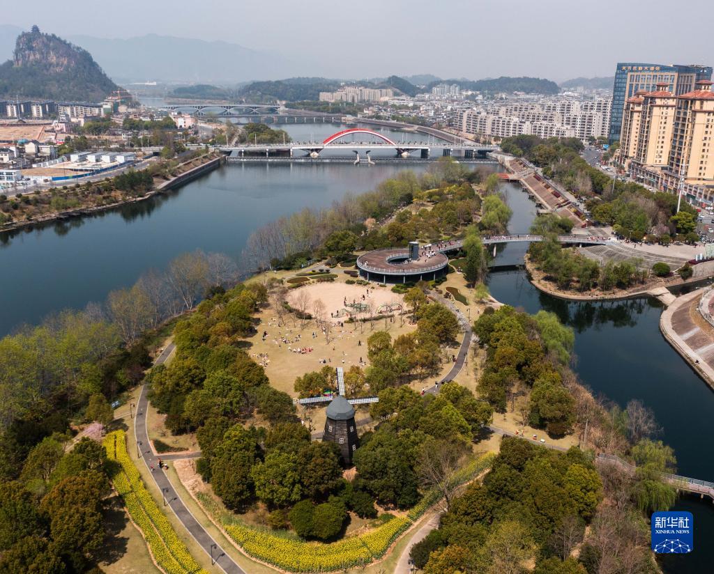 空中俯瞰浙江省麗水市松陽(yáng)縣松陰溪中的生態(tài)景觀(guān)生態(tài)灘健康主題公園,清澈的江水環(huán)繞著(zhù)美麗的生態(tài)公園,成為了當地百姓健身休息的好去處(3月15日攝,無(wú)人機照片)。