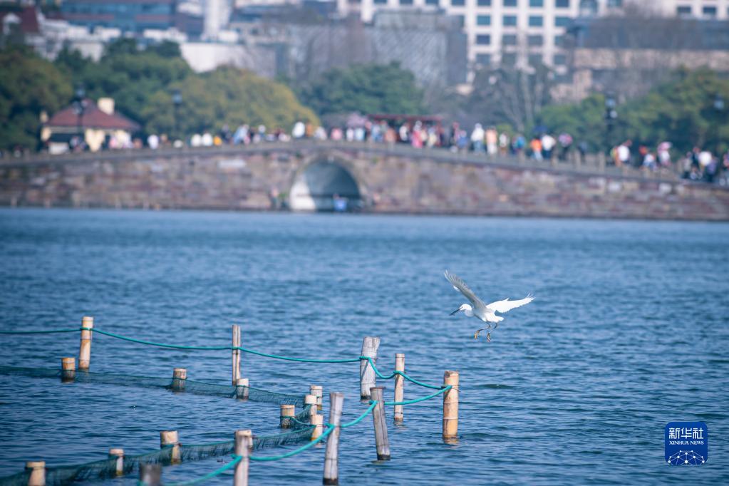 3月15日,水鳥(niǎo)在杭州西湖斷橋附近的湖面上飛翔。