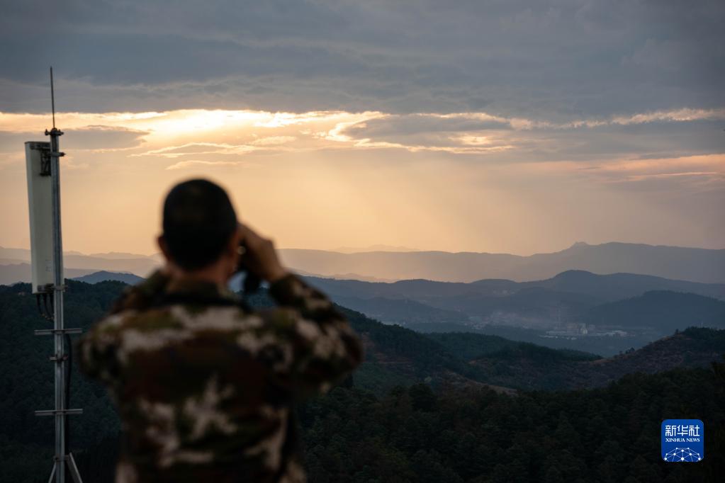 護林員陳華在昆明??诹謭?chǎng)瞭望臺瞭望(3月20日攝)。