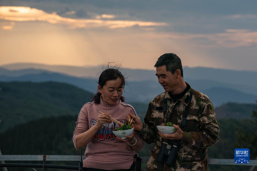 護林員陳華(右)在昆明??诹謭?chǎng)瞭望臺和妻子吃晚飯(3月20日攝)。