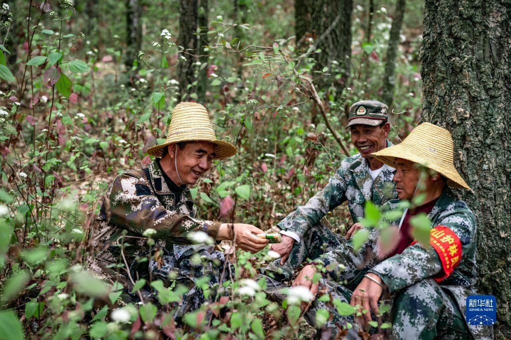護林員陳華(左)在巡山途中休息(3月20日攝)。