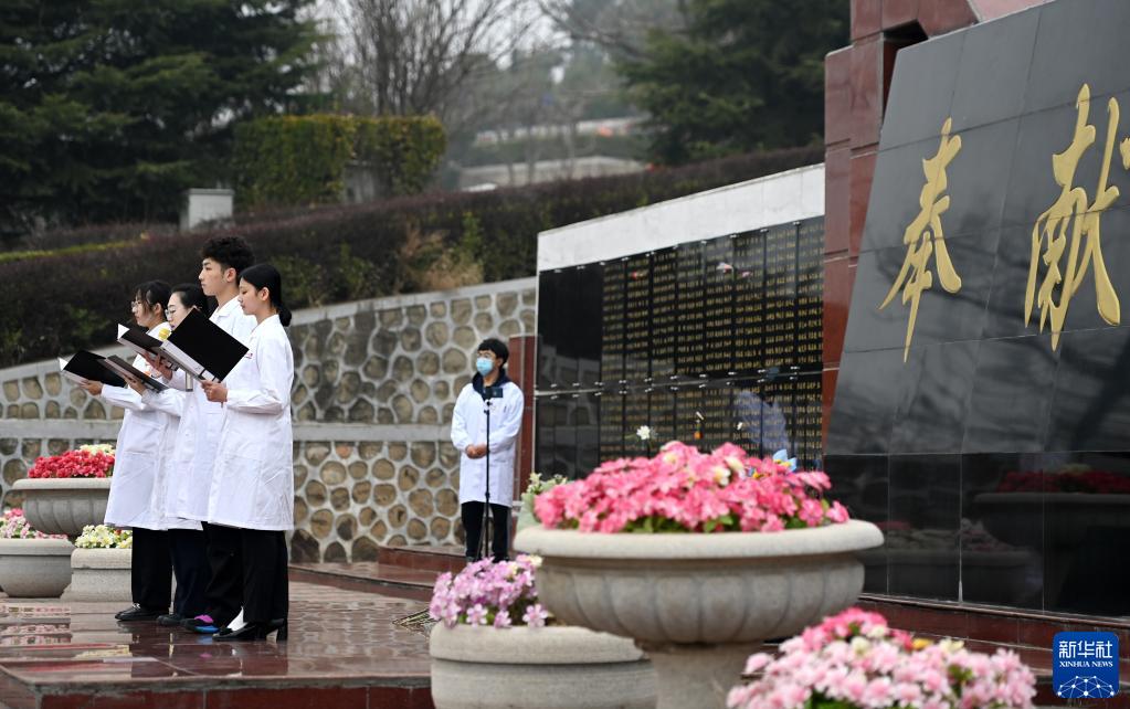 3月21日,在天津市薊州區元寶山莊生命紀念公園,天津醫科大學(xué)學(xué)生在奉獻碑前進(jìn)行詩(shī)朗誦《生命的禮物》。