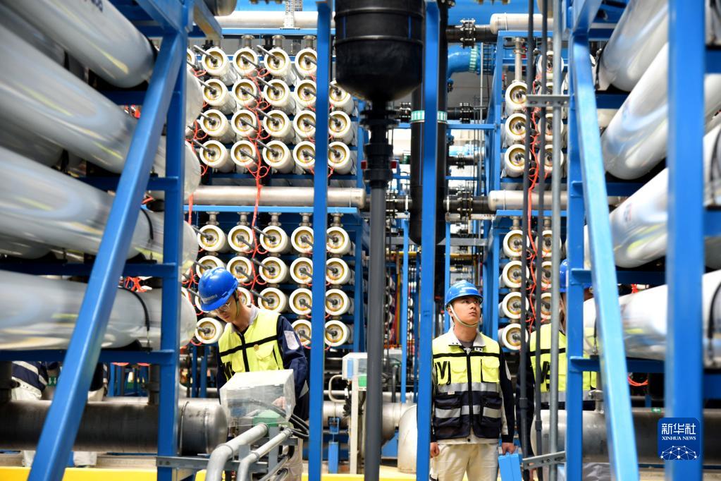3月20日,工作人員在青島水務(wù)百發(fā)海水淡化廠(chǎng)生產(chǎn)車(chē)間作業(yè)。