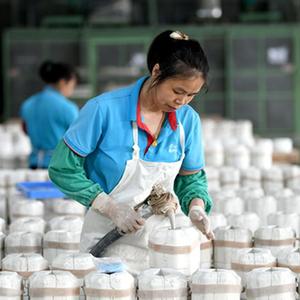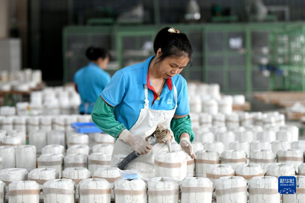 3月21日,在德化一家陶瓷企業(yè)生產(chǎn)車(chē)間,工人給陶瓷空心注漿。
