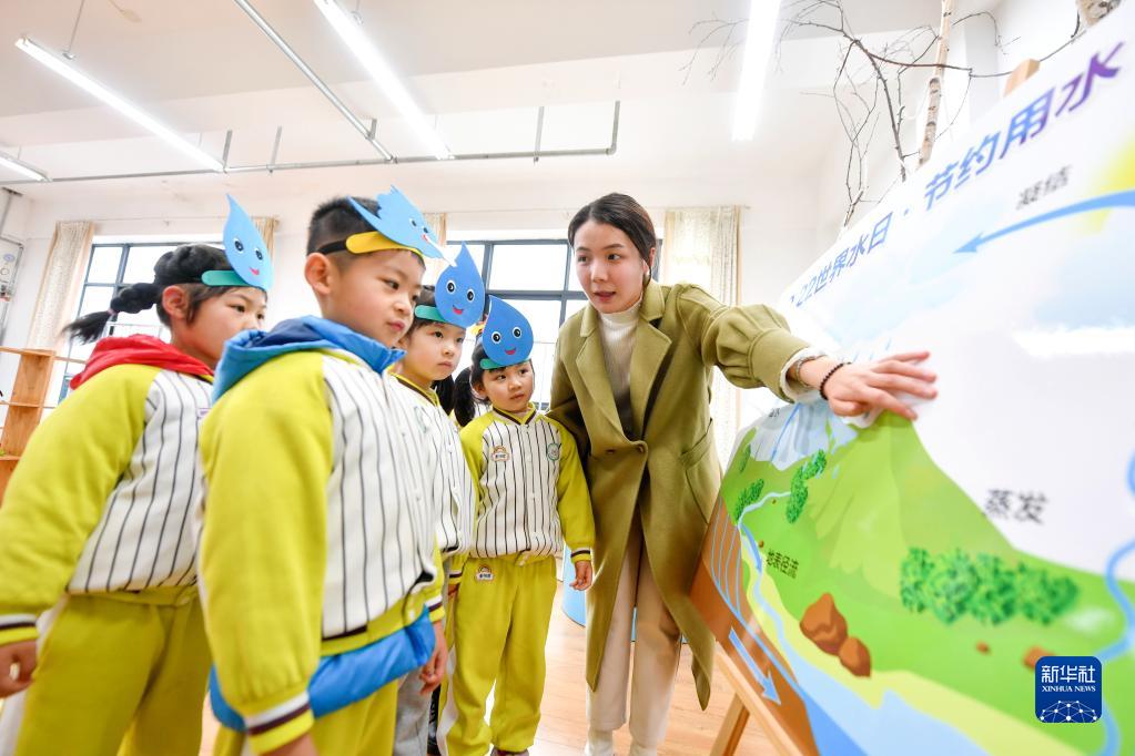 3月21日,浙江省湖州市長(cháng)興縣龍山幼兒園的教師為孩子們講解水循環(huán)知識。