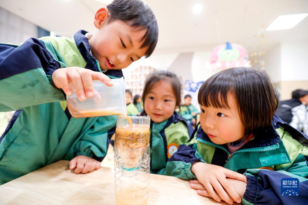 3月21日,江西省吉安市峽江縣城南幼兒園的小朋友在體驗凈水小實(shí)驗。
