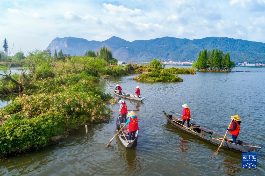 3月20日,巾幗打撈隊隊員在滇池草海打撈水草(無(wú)人機照片)。