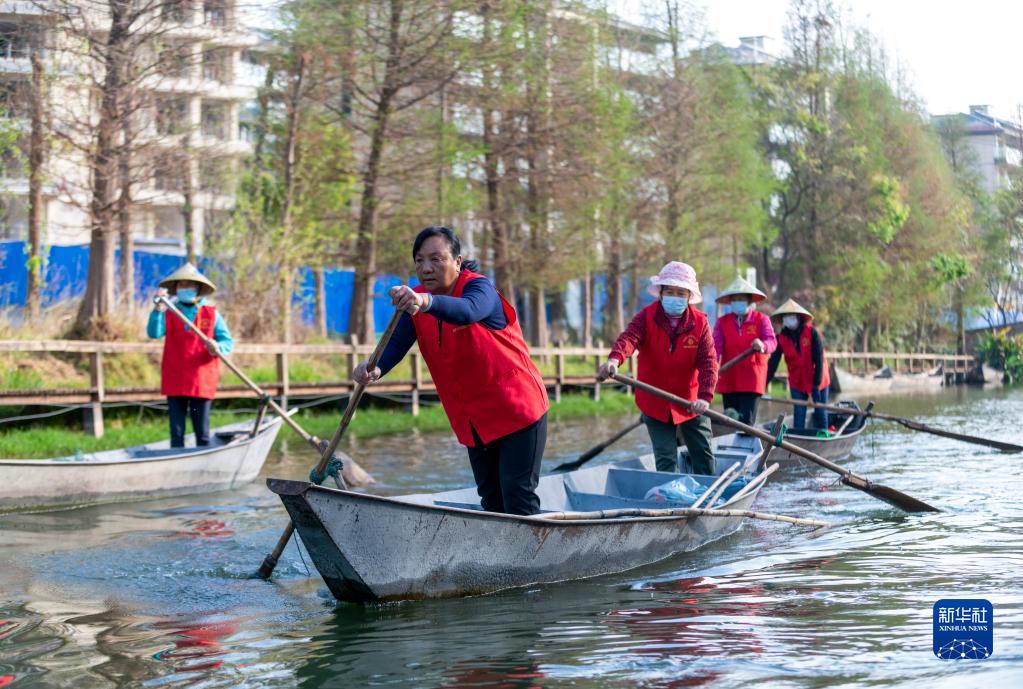 3月20日,李云麗(左二)帶領(lǐng)巾幗打撈隊隊員劃船準備到滇池草海開(kāi)展打撈工作。