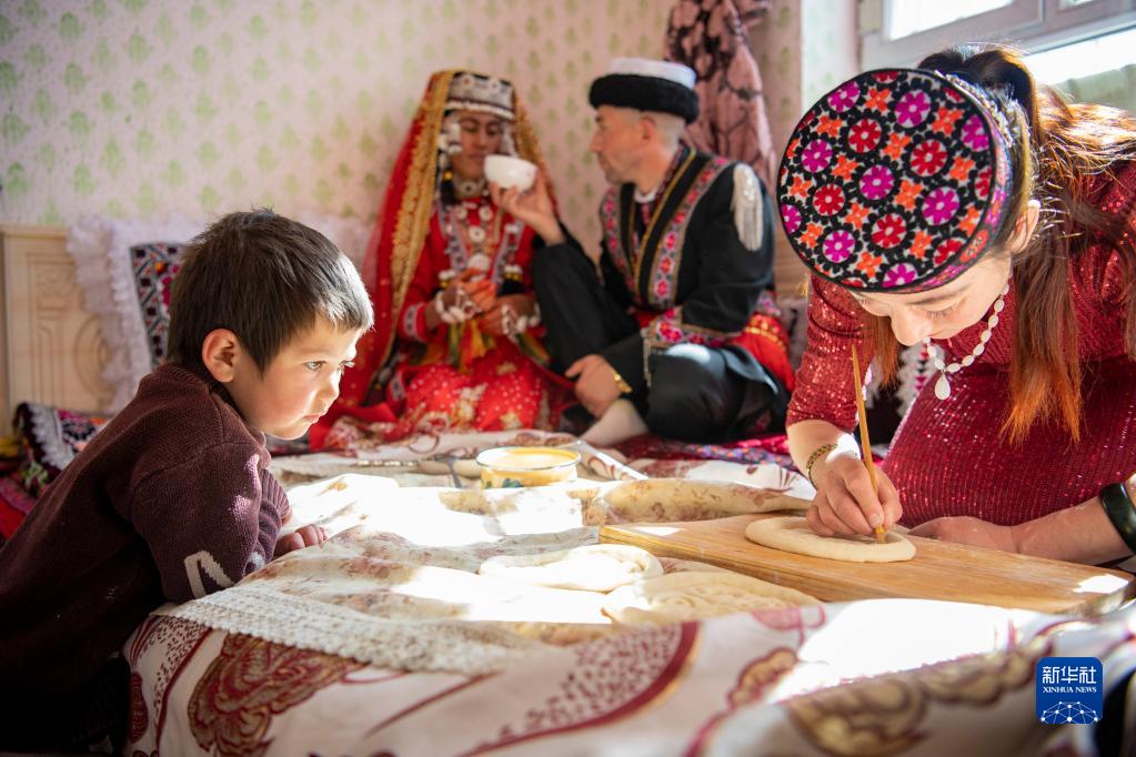 在位于縣城的新家中,新郎買(mǎi)熱買(mǎi)提汗·青鐵木爾的姐姐為一對新人制作象征祝福的馕餅,新郎的小侄女在一旁好奇觀(guān)看(3月20日攝)。