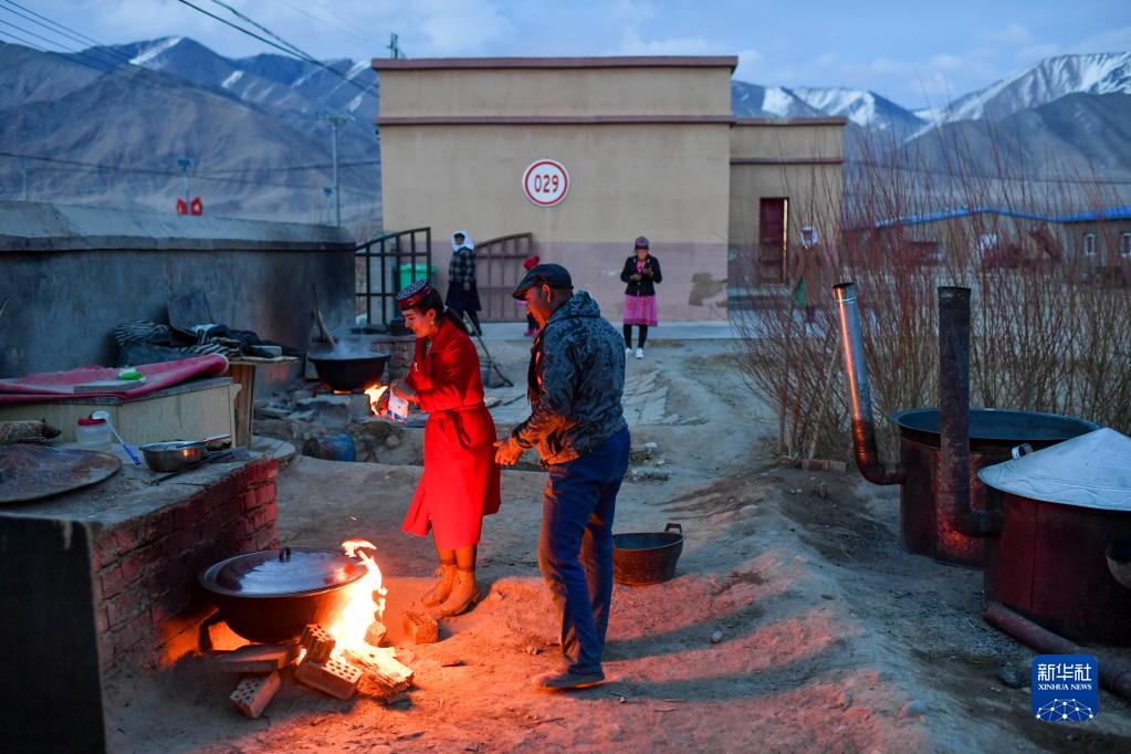 新郎買(mǎi)熱買(mǎi)提汗·青鐵木爾的姐姐(左)為參加婚禮的親友在門(mén)前小院做晚餐(3月18日攝)。