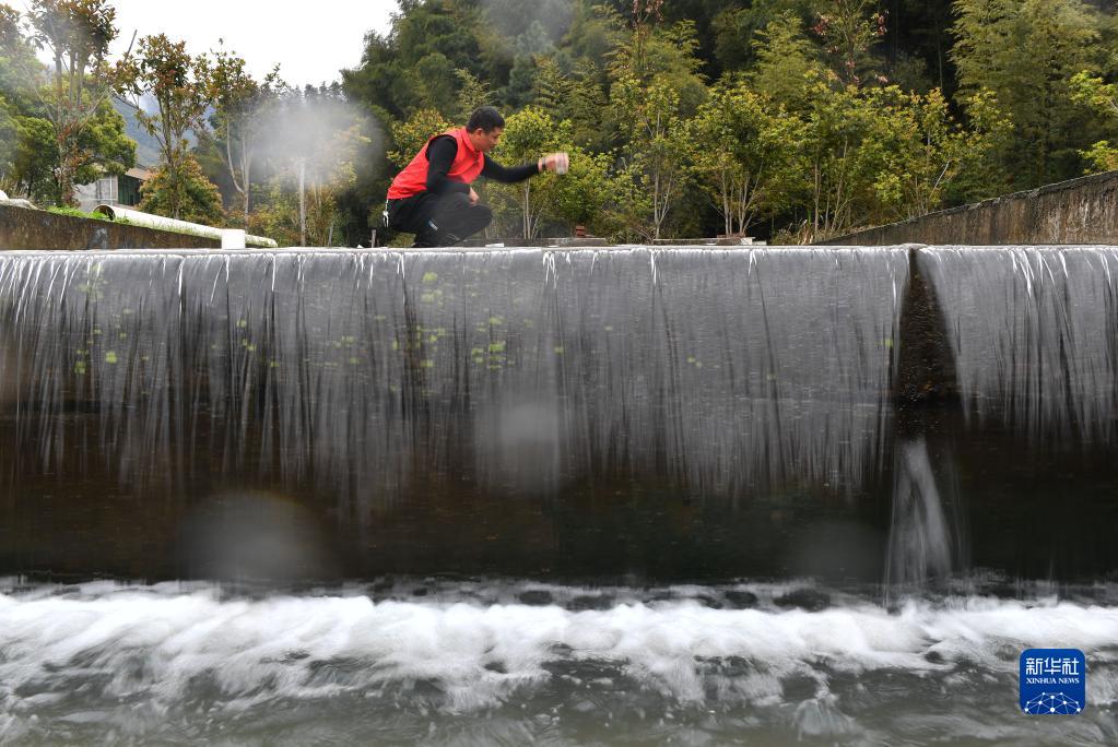 3月22日,衡山縣嶺坡鄉燈山村“泉水瘦身魚(yú)” 養殖基地工作人員在觀(guān)測水質(zhì)。