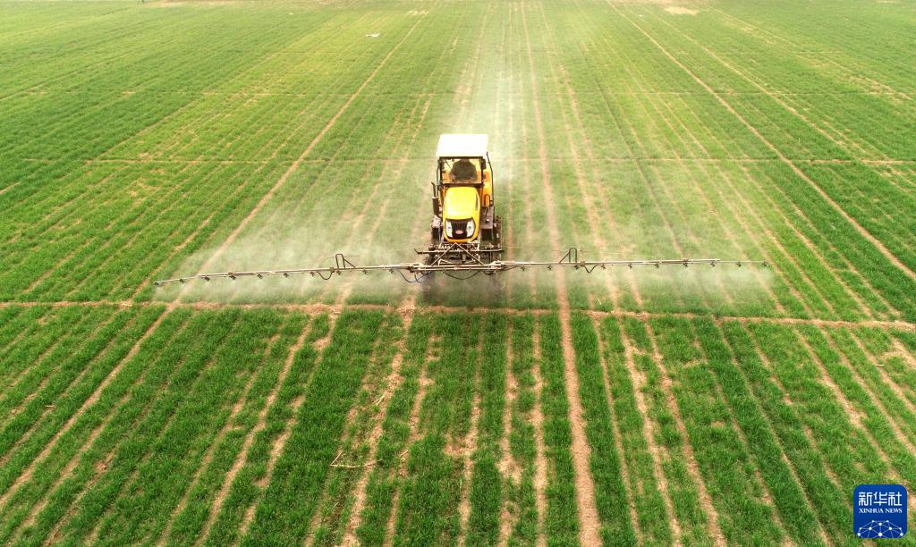3月22日,在石家莊市欒城區南高村,村民駕駛自走式噴桿噴霧機給小麥噴灑營(yíng)養液(無(wú)人機照片)。
