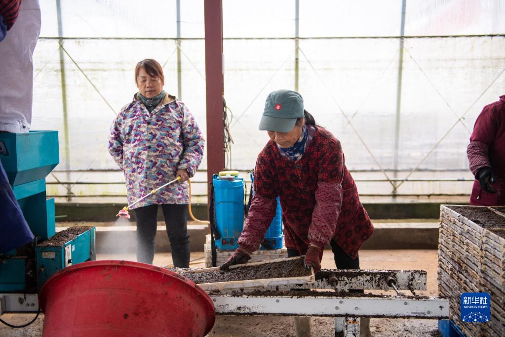3月22日,在桃源縣金鳳橋水稻育秧工廠(chǎng),村民在搬運秧盤(pán)。