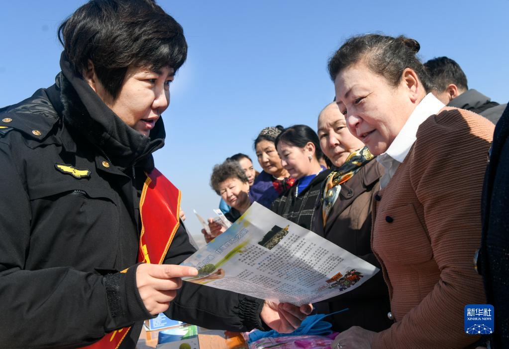 3月22日,在烏魯木齊水業(yè)集團有限公司烏拉泊水庫管理站,烏魯木齊市生態(tài)環(huán)境局天山區分局工作人員(左)給居民講解烏魯木齊飲用水的來(lái)源。