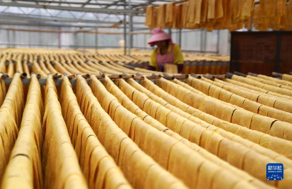 3月21日,石屏縣一家豆制品生產(chǎn)企業(yè)的工作人員在晾曬豆腐皮。