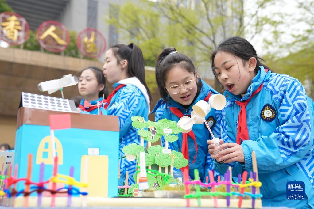 3月22日,浙江省湖州市長(cháng)興縣第二實(shí)驗小學(xué)學(xué)生在體驗自己制作的微型氣象站模型。