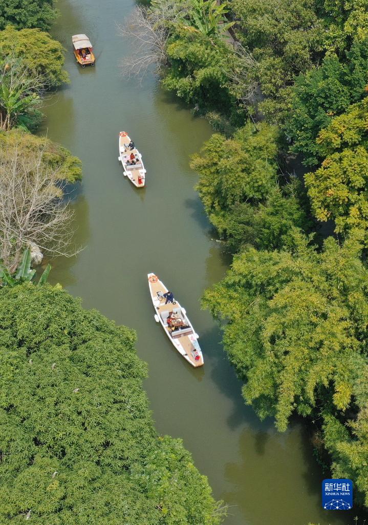 2月25日,游客乘船游覽福州白馬河(無(wú)人機照片)。