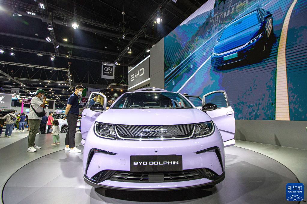 3月22日,觀(guān)眾在泰國曼谷國際車(chē)展上參觀(guān)比亞迪海豚汽車(chē)。