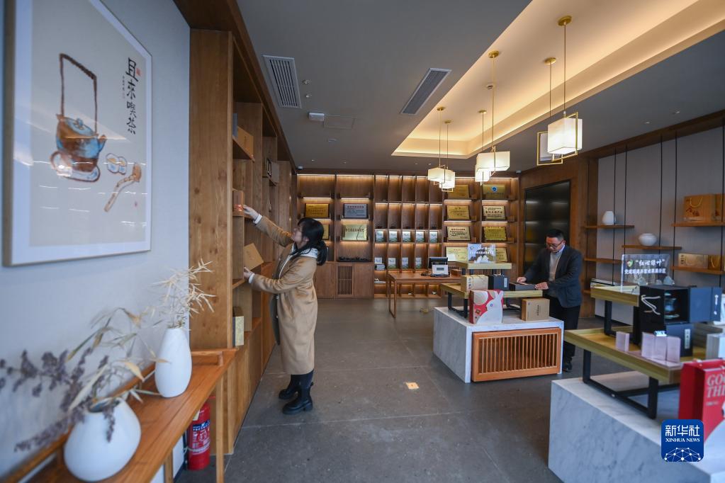3月23日,在里山鎮安頂村的安頂云霧共富集市內,回鄉創(chuàng )業(yè)的新鄉賢夏燕龍(右)與鎮干部一起把特色農產(chǎn)品擺放上架,方便游客選購。
