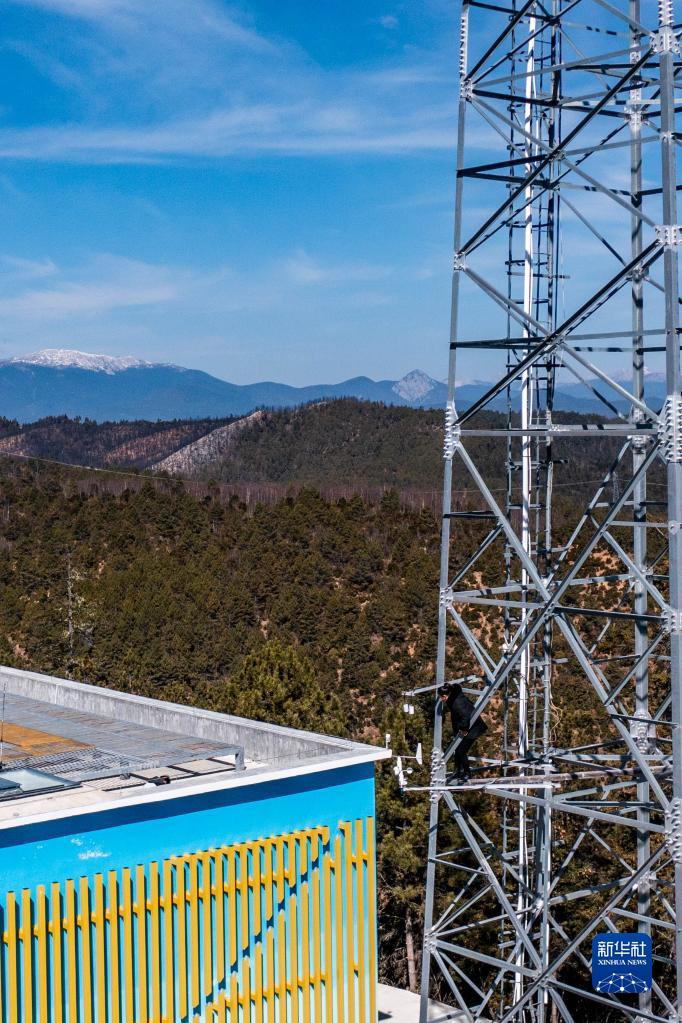 工作人員彭小清在香格里拉國家大氣本底站巡查鐵塔溫室氣體10米進(jìn)氣口(3月9日攝,無(wú)人機照片)。
