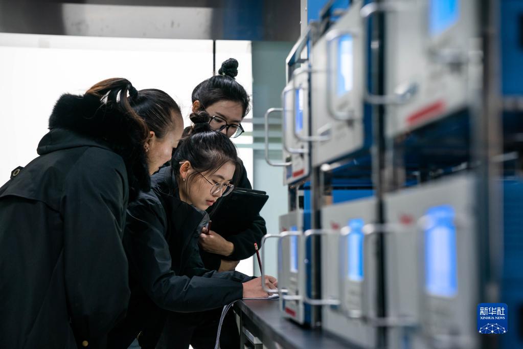 工作人員殷鉞淼(中)和彭小清(左)、李曉莉在香格里拉國家大氣本底站大氣成分業(yè)務(wù)用房對反應性氣體進(jìn)行巡視(3月9日攝)。
