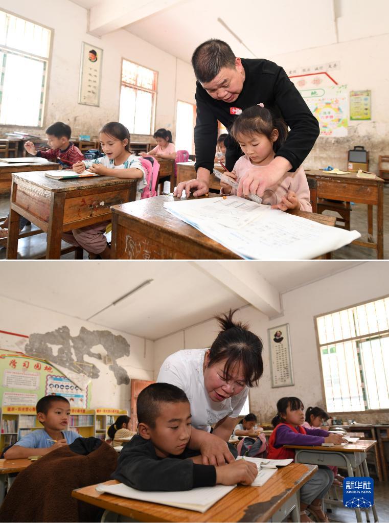 這是一張拼版照片:在廣西德??h東凌鎮那王小學(xué),黃永勇(上圖)和黃秀碧(下圖)在課堂上輔導學(xué)生功課(3月22日攝)。