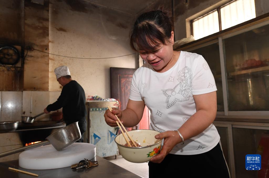 在廣西德??h東凌鎮那王小學(xué),黃秀碧(右)和黃永勇在給學(xué)生做午餐(3月22日攝)。