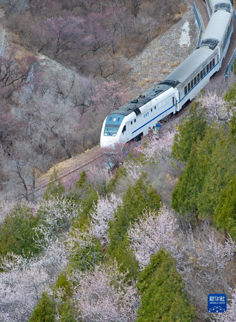 近日,北京居庸關(guān)長(cháng)城腳下山花漸次開(kāi)放。北京市郊鐵路S2線(xiàn)列車(chē)穿行于花海間,成為春日里一道美麗的風(fēng)景。