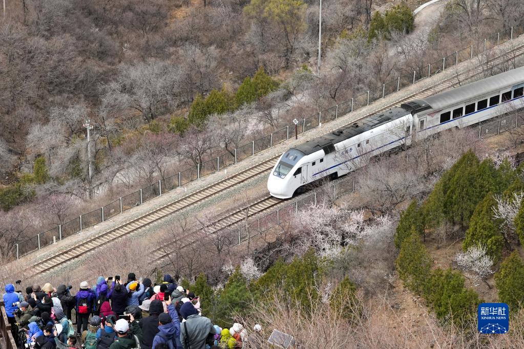 3月23日,游客在拍攝行駛在居庸關(guān)長(cháng)城腳下花海中的S2線(xiàn)列車(chē)。