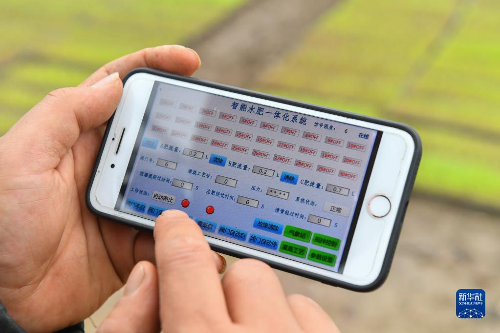 3月23日,在湘潭市雨湖區姜畬鎮青亭村一處多功能育秧大棚里,農民在手機上設置智能水肥一體化系統。
