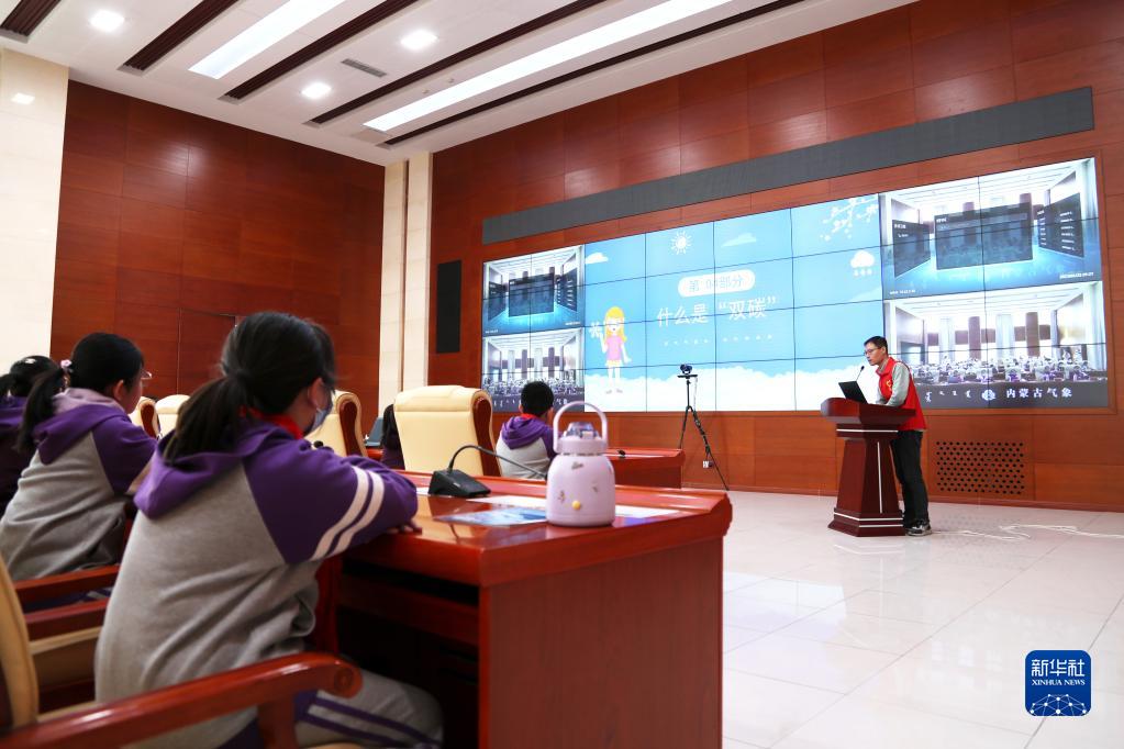 3月23日,工作人員在內蒙古自治區氣象臺為學(xué)生講解氣象知識。