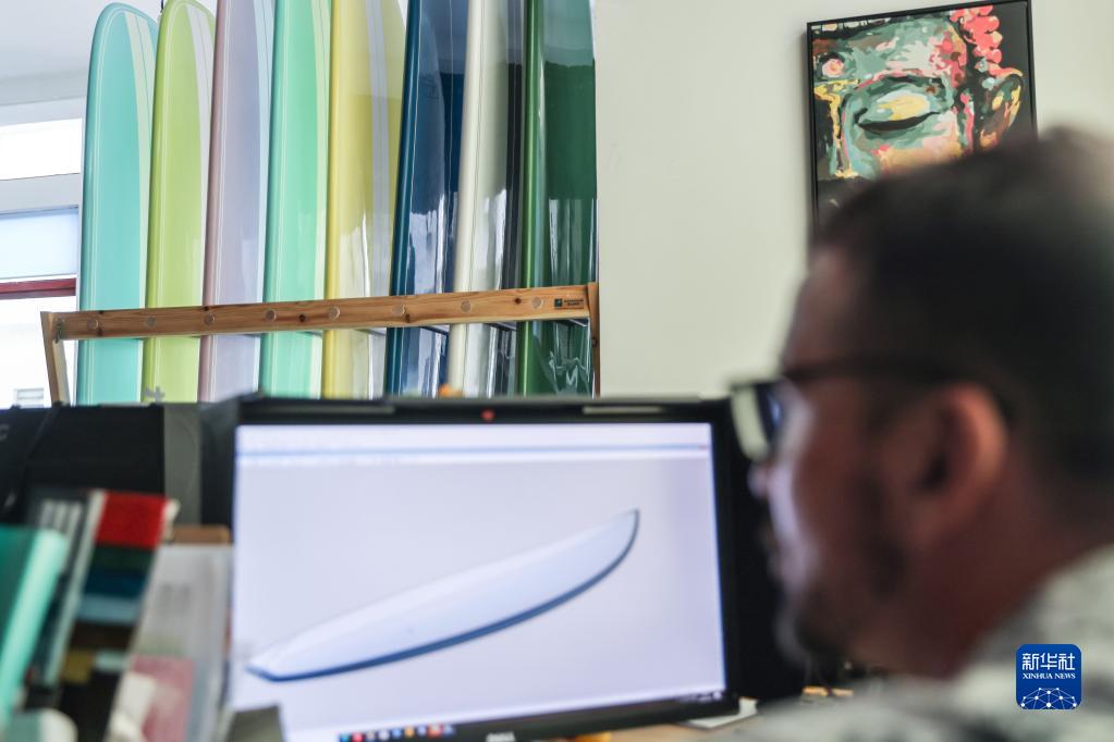 3月18日,亞歷山大在海南博鰲的店里用電腦設計沖浪板。