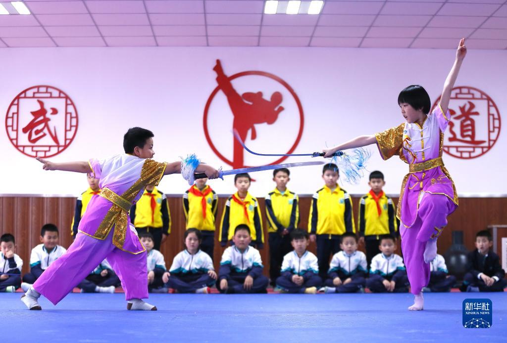 3月23日,青島市通濟實(shí)驗學(xué)校的學(xué)生在大課間進(jìn)行武術(shù)劍對練。