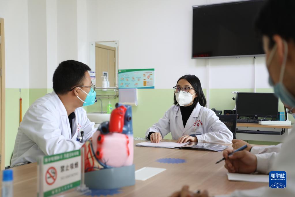 3月23日,在通渭縣人民醫院內科樓,青島市醫療“組團式”幫扶團隊醫生李培慧(左二)和當地醫生交流病例治療方案。