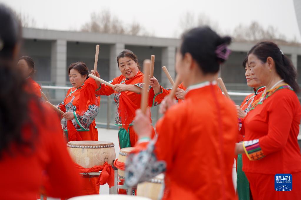 3月23日,群眾在內丘縣邢窯博物館廣場(chǎng)學(xué)習慶源排鼓。