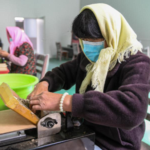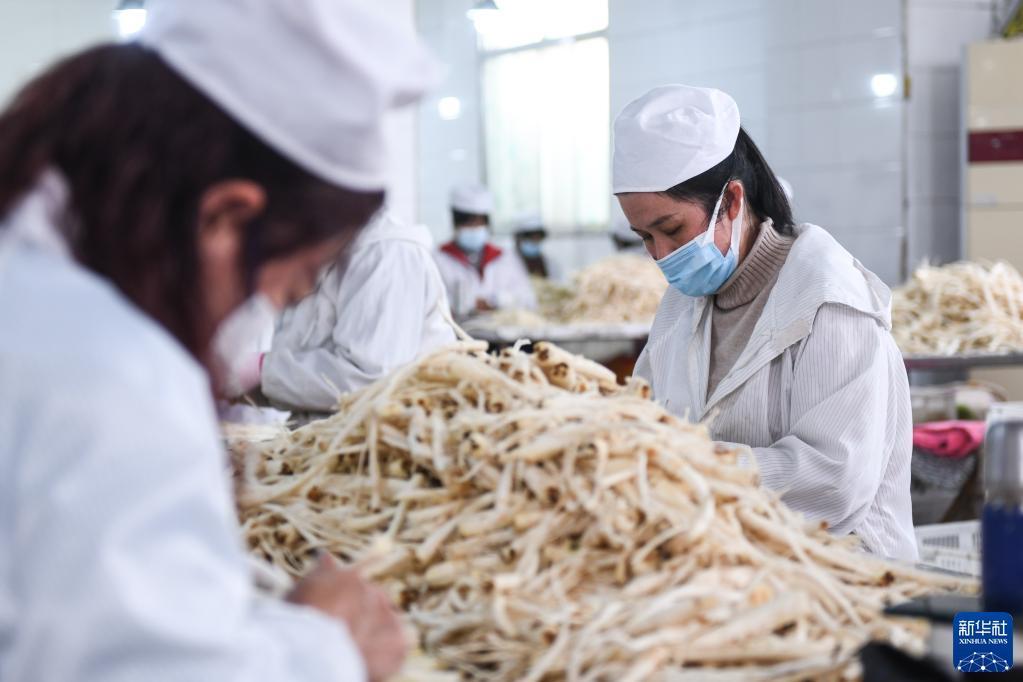3月23日,村民們在南魯山鎮沂源華康食品有限公司共富車(chē)間內加工桔梗。