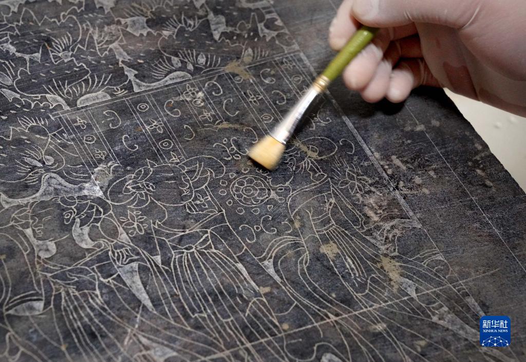 工作人員在清理圍屏石棺床石屏風(fēng)上的圖像(3月15日攝)。