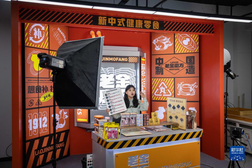 在位于杭州市的浙江仁之初健康產(chǎn)業(yè)有限公司直播間內,主播在推介零食產(chǎn)品(3月23日攝)。
