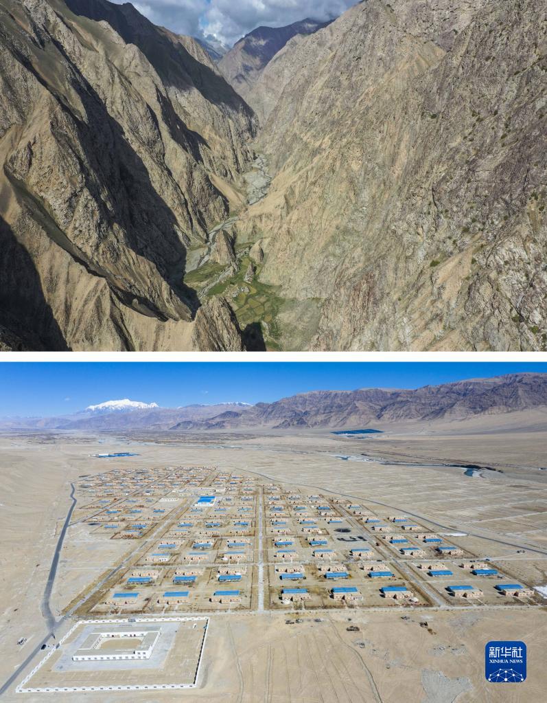 這是一張拼版照片,上圖為都熱·加爾曼一家搬遷前所居住的大同鄉阿克托尕欄桿村一小隊的山谷(無(wú)人機照片,2019年6月20日攝);下圖為都熱·加爾曼家搬遷后所在的安置點(diǎn),現已命名為富民村、愛(ài)民村(無(wú)人機照片,2023年3月17日攝)。
